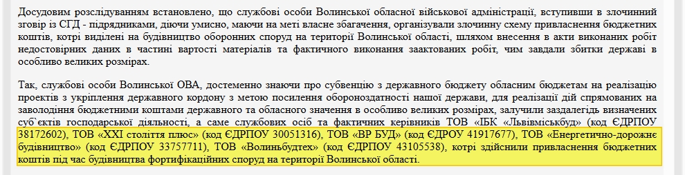Зокрема, у березні 2024 року органи правопорядку відкрили кримінальне провадження щодо розкрадань на будівництві фортифікацій у Волинській області. Розслідується змова між посадовцями Волинської ОВА та представниками підрядних організацій щодо привласнення коштів на закупівлях. Серед фігурантів — ТОВ «Енергетично-дорожнє будівництво».