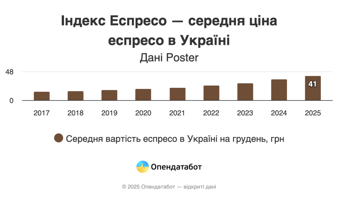 Регіон вперше за останні роки очолив “кавовий рейтинг”, витіснивши багаторічного південного лідера. Одещина, яка два роки поспіль була рекордсменом за цінами на каву, у грудні 2025 року опинилася на другому місці — 45 гривень за еспресо.