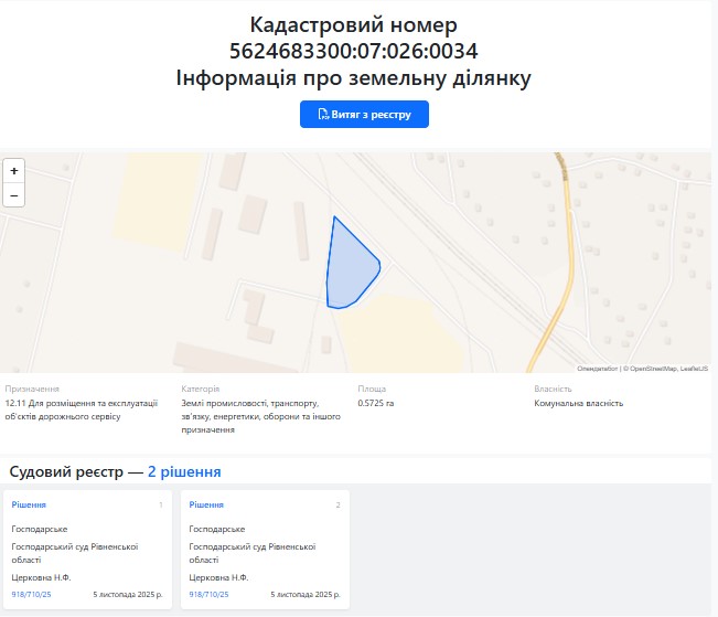 Господарський суд Рівненської області своїй Рішенням №131613529 від 5 листопада 2025 року визнав договір купівлі-продажу земельної ділянки недійсним.