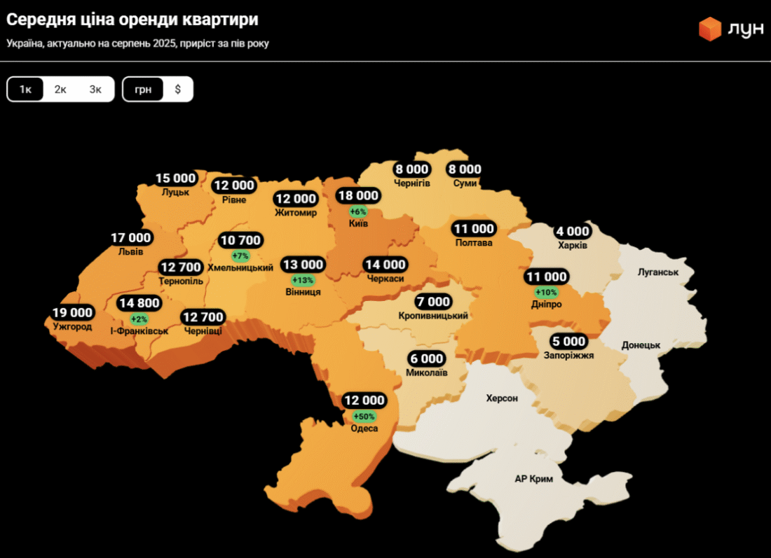 Найвищі ціни на оренду – в Ужгороді (Закарпатська область). В найзахіднішому місті країни оренда 1-кімнатної коштуватиме, в середньому, 19 тис. грн. Це підтверджує, що лідером з вартості оренди нині є не столиця, а найзахідніша область країни.