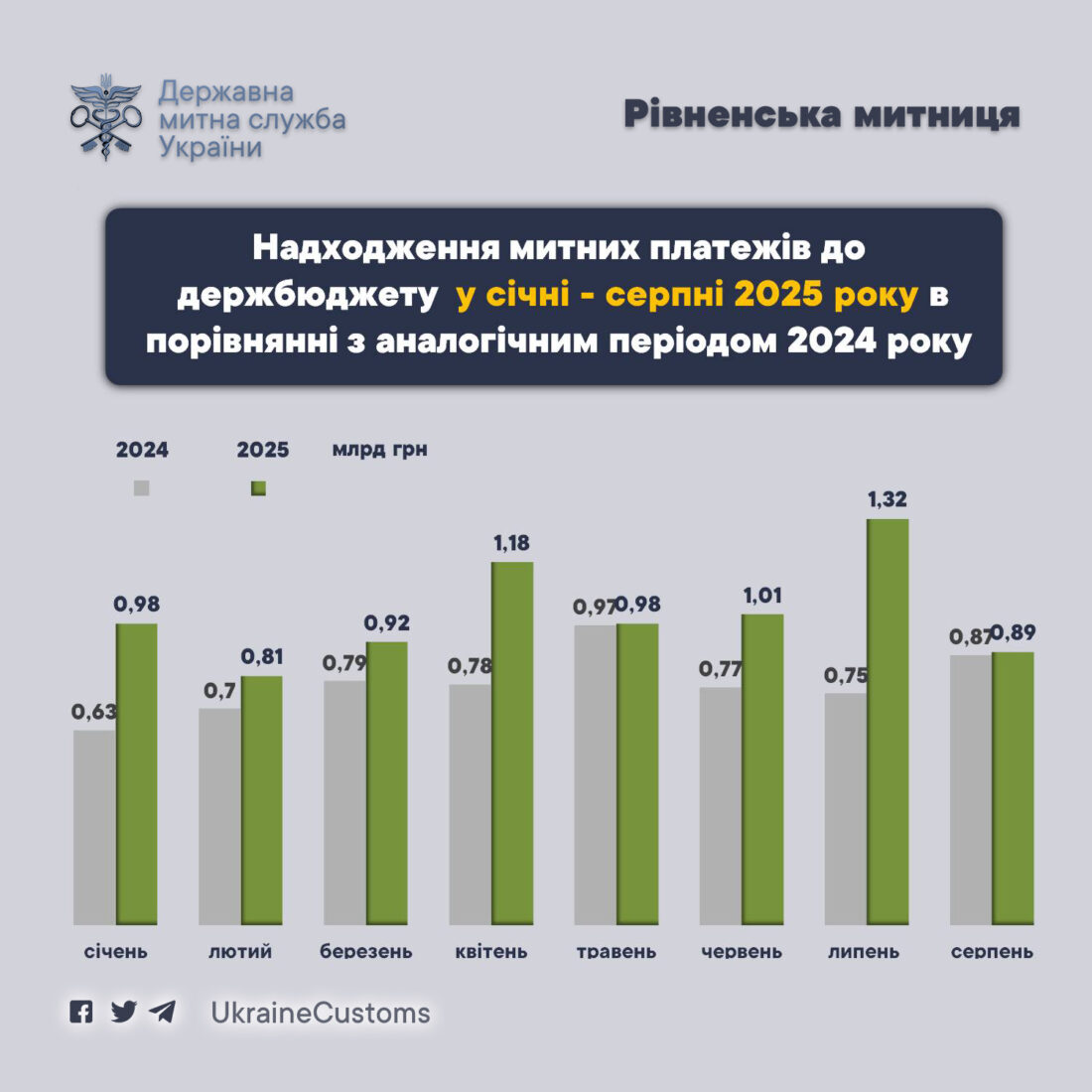 За 8 місяців 2025 року Рівненська митниця зібрала з експортерів та імпортерів до державного бюджету більше 8 мільярдів гривень митних платежів. Як зазначають у Державній митній службі України, це на 29% більше, ніж минулого року.