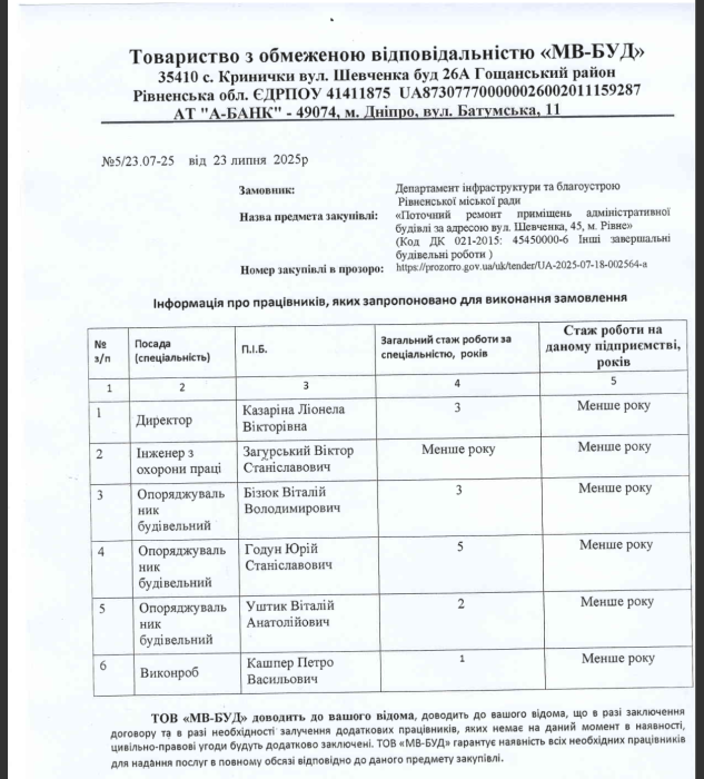Так, детально передивившись документи з пропорзицій ТОВ «МВ-Буд», які вони подавали на відкритих торгах, ми помітили, що фактично працівників почали наймати лише в 2025 році. А власник фірми Загурський одночасно працює інженером з охорони праці.