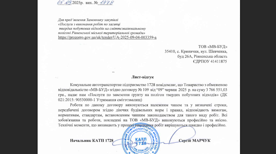 Належний досвід ТОВ «МВ-Буд» у засипці побутових відходів засвідчував Сергій Марчук, директор комунального автотранспортного підприємства 1728. Саме ж комунальне підприємство на своєму тендері досвід учасника не перевіряло.
