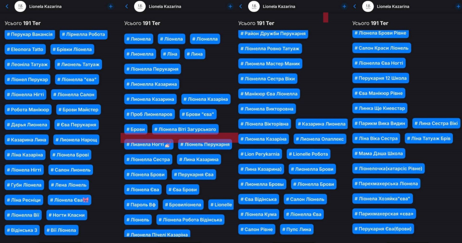 За номером Ліонели бачимо теги, які стосуються виключно манікюру, брів, вій, губ та перукарні. Також ми помітили теги, які дають зробити висновки, що Віктор Загурський та Ліонела Казаріна, ймовірно, подружжя.