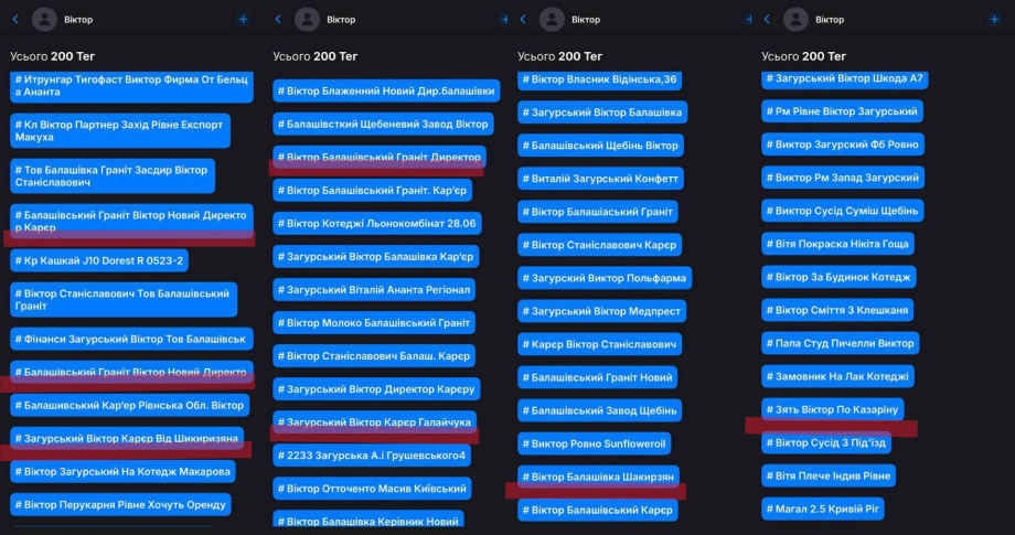 Так, номер Віктора Загурського, який він зазначав, коли був ФОПом, неодноразово підписували з прив’язкою до Балашівського кар’єру/граніту («заступник директора», «новий директор», «від Шакирзяна» тощо).