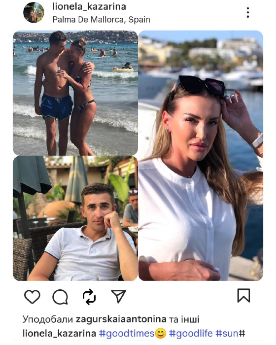 За інстаграмом жінки, вона часто буває на відпочинку за кордоном, як і Віктор Загурський. Зважаючи на спільні фото Казаріної та Загурського,