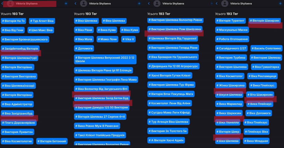 Також її ім’я записували з прив’язкою до таких фірм, як «Захід-трансбуд», «Західбетонбуд» та навіть прізвища Шакирзян: «Виктория Шиляє Пом Шакірзяна», «Віка Шакирзяна», «Вика Шакирзян», «Вікторія Шакирзян», «Віка від Шакирзяна», «Жінка Шакирзяна».